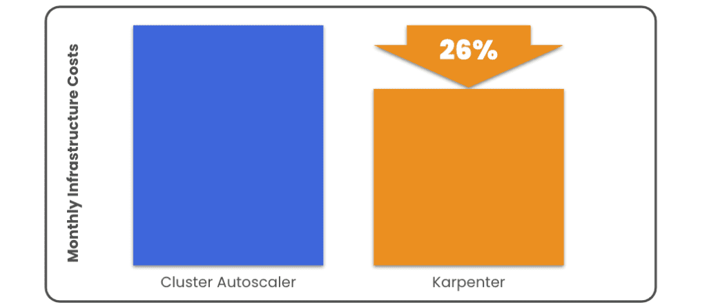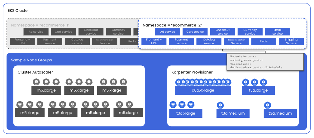 In this case, we can see that Karpenter is much more intelligent about understanding the resource requests being made and finding a mix of instances that provide the required compute capacity while minimizing over-provisioning and costs when compared to traditional Cluster Autoscaler configurations.