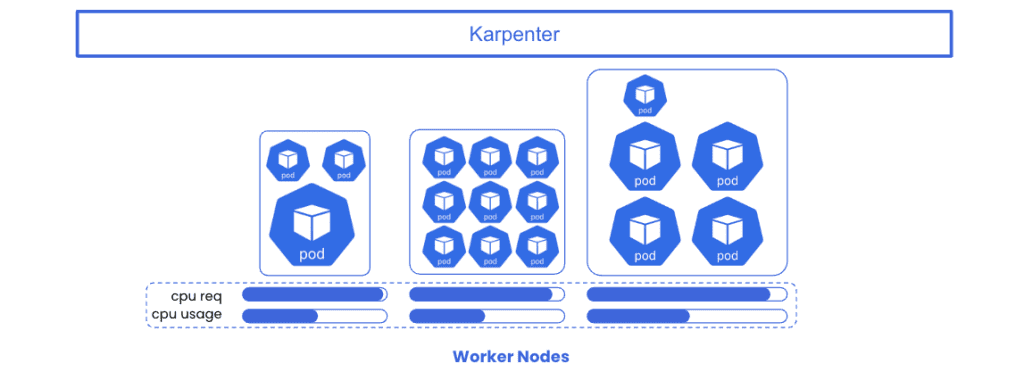 It improves upon the Kubernetes-native Cluster Autoscaler, by providing intelligent node autoscaling and opportunistic workload consolidation in an effort to improve the match between node resource capacity and workload requests. Karpenter is also optimized to provision and deprovision a wider array of instance types when compared to standard auto-scaling groups. The result being much improved cost performance and better utilization of compute resources.