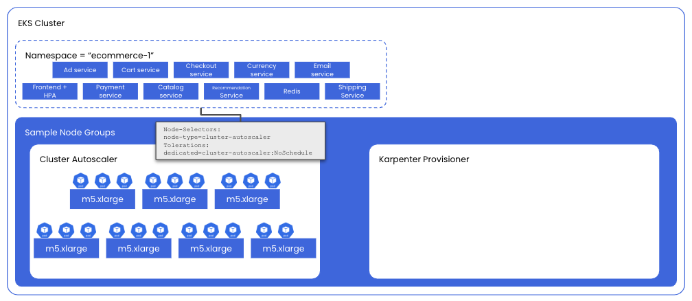 In order to illustrate the differences between node provisioning between Cluster Autoscaler and Karpenter, we will be using a couple of tools against our sample environment: