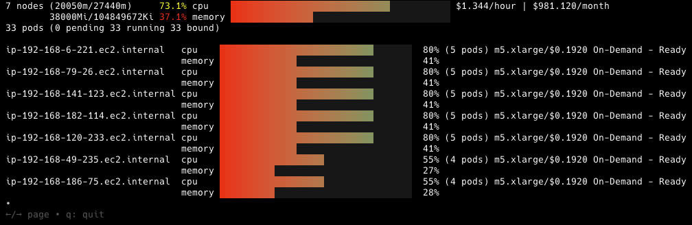 With all 20 microservices demo pods successfully running, we can use eks-node-viewer to visualize the monthly costs for these instances.