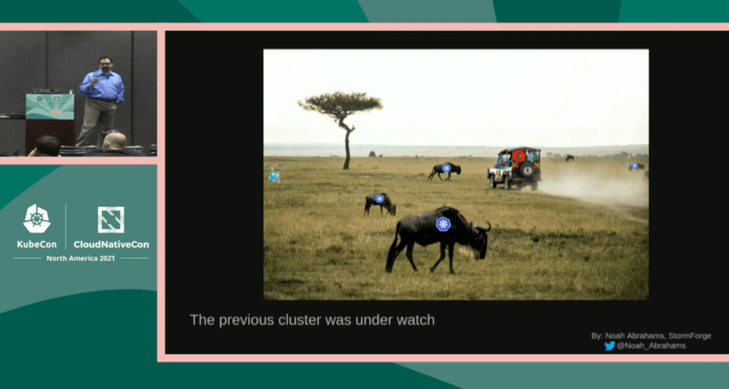 My talk was officially titled “A Safari of Kubernetes and its Natural Habitat”, and I gave it on Day 1, only about an hour after the opening keynotes ended. I mentioned in the talk that the entire idea sprang forth from a discussion of “What would be YOUR KubeCon keynote walk-on music?” but it quickly grew beyond that. At StormForge, we’ve continually pushed on the message of sustainability and ecological accountability in technology, specifically in cloud applications and what is perceived as an infinite amount of resources for them to grow into, as long as you’ve got the budget to back it up. That, however, ends up as a waste of both financial and natural resources, and I really wanted to draw some analogies between the natural world (Wildebeest being eaten by lions) and the technological world (“Our AWS bill is WHAT?!”). This ended up serving multiple purposes.